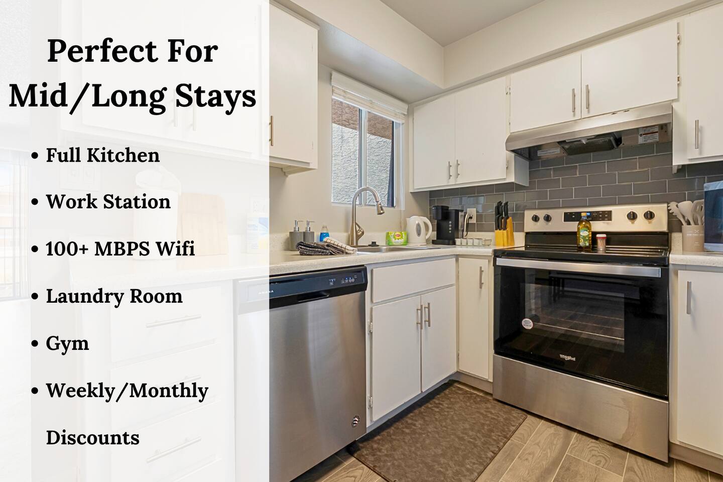 Thanks for considering booking with me! I welcome mid/long term stays! Enjoy a comfortable 1BR just minutes from Downtown Mesa. - Fast WiFi -Fully Equipped kitchen -50" smart TV -Free parking -Pool -Gym -Laundry PLEASE NOTE: this is an 2nd floor apartment in an older building that has renovated units. Not luxury apartments. Perfect for someone looking for a no-frills comfortable stay that meets all their needs. Send me a message if you have any additional questions!